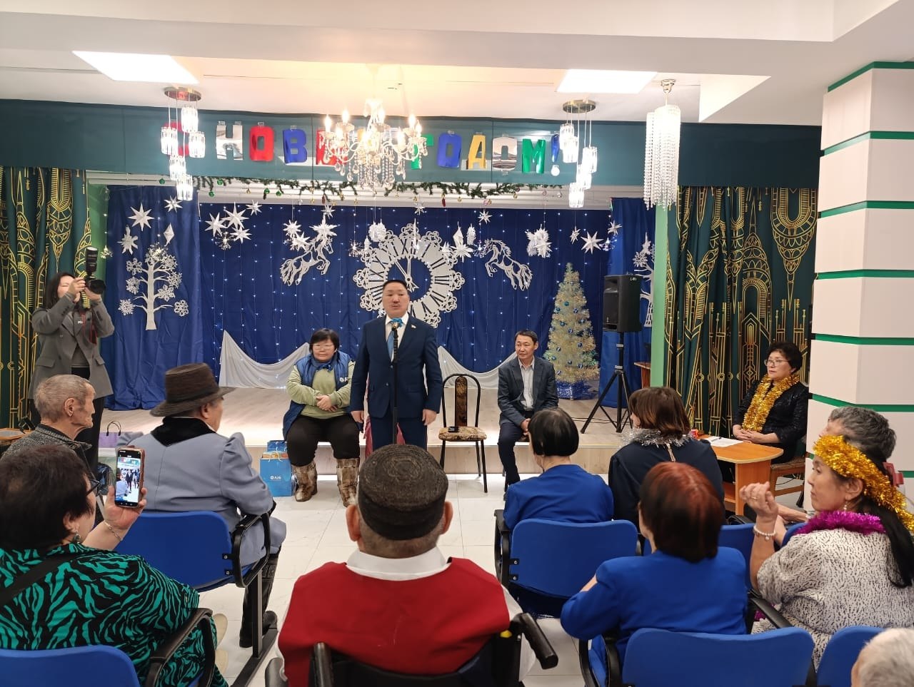 29 декабря — жители и работники Нюрбинского ДИПИ отметили Новый год! Получателей социальных услуг поздравили Глава Нюрбинского района А.М.Иннокентьев и представитель Нюрбинского филиала АКБ «Алмазэргиэнбанк» Иннокентьева И.А. В связи ремонтом дома Алексей Михайлович подарил коллективу пылесос и сладкие наборы для ветеранов (они были переданы нашим активистам — оформителю Степану Романову и автору стихов в честь окончания ремонта Василию Федорову и т.д.) Наш социальный партнер — коллектив АКБ АЭБ (рук.Гуляева И.Г.), передал нашим жителям очень нужные наборы для реализации проекта «Незабудка» для пожилых — тренировки памяти, внимания и мышления. Спасибо, дорогие друзья! Добро возвращается добром! Счастливого нового года! P.S. При просмотре фотоматериалов просим обратить внимание на задний план сцены — художественное вырезание из бумаги Романова С., а также для истории оставляем на канале авторское исполнение стихов Федорова В.